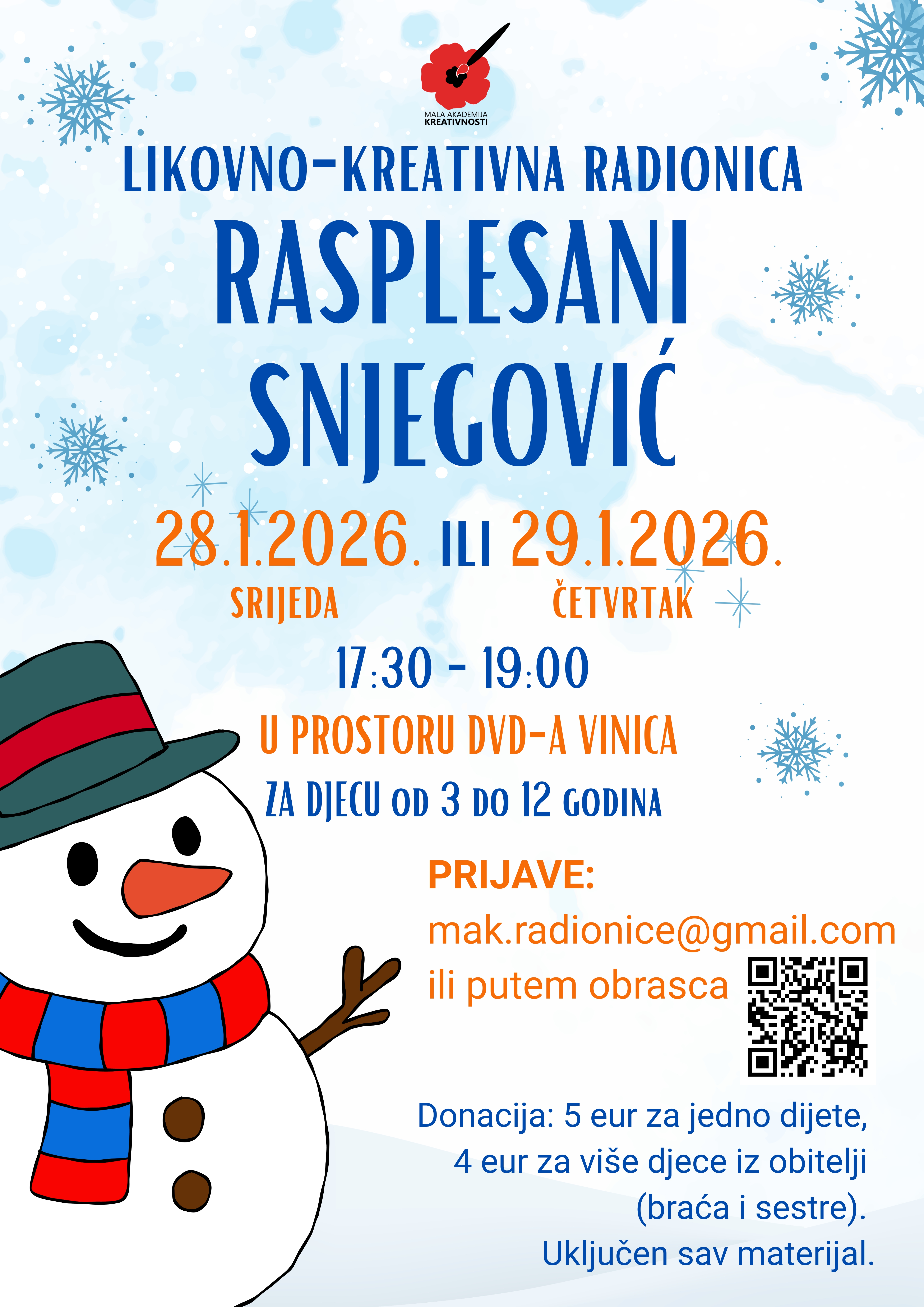Pozivamo svu djecu od 3 do 12 godina na zimsku, veselu i kreativnu radionicu „Rasplesani snjegović“ u organizaciji Male akademije kreativnosti!