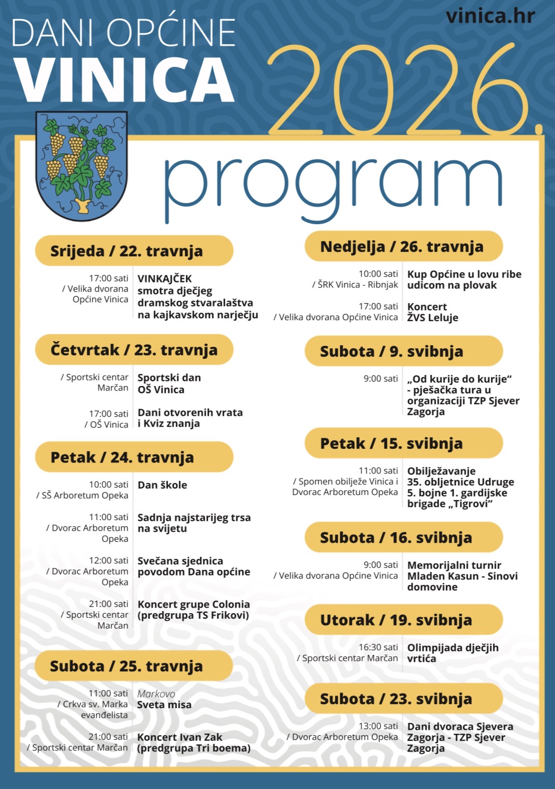 Općina Vinica i ove godine priprema bogat i raznolik program povodom Dana Općine Vinica 2026. Tijekom travnja i svibnja očekuju vas kulturni, sportski, svečani i zabavni sadržaji za sve generacije.